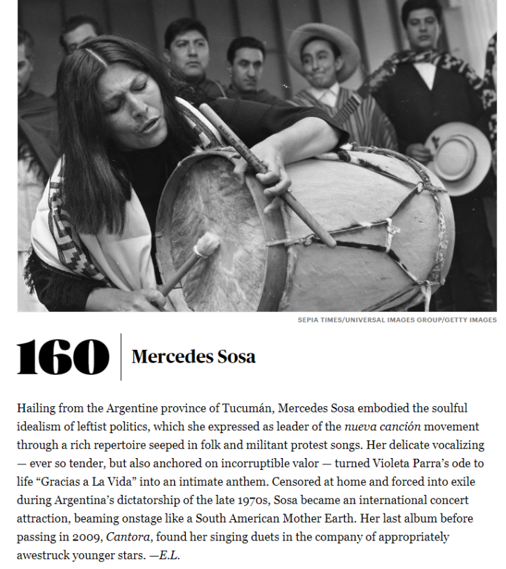 Esa “conversación global” a la que hacen referencia permitió que La Negra Sosa, ícono de la música de nuestro país, se quede con el puesto número 160 de esta gran elección. Se encuentra entre la cantante de country Brenda Lee y el cantautor de blues y folk John Hurt.