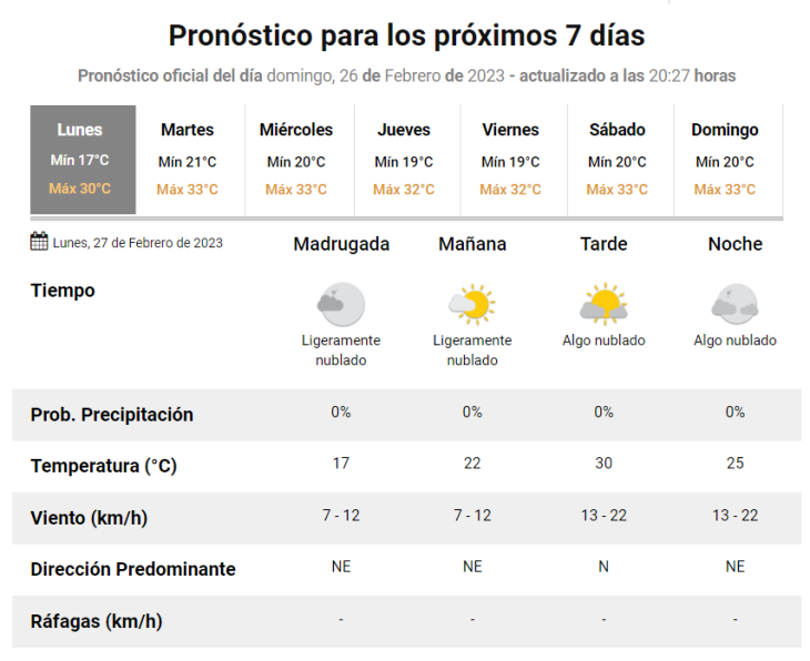 De este modo, se espera que el termómetro ronde entre los 17°C y 29°C. Las mismas condiciones se esperan para el martes y el miércoles, días en que se alcanzarán los 32°C. Durante la tarde-noche de este último el tiempo podría desmejorar y se esperan lluvias.