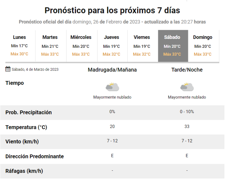 Para el fin de semana, se espera un cielo completamente nublado como también la aparición de un frente de vientos provenientes del norte.