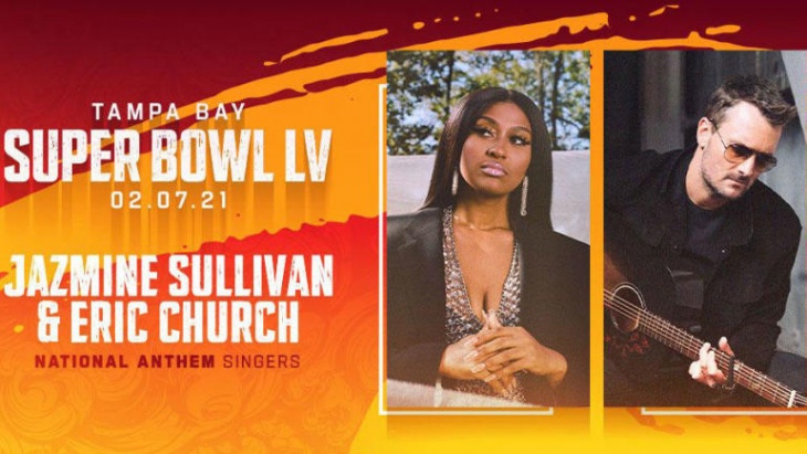 Los artistas nominados al Grammy Eric Church y Jazmine Sullivan colaborarán por primera vez para interpretar el himno nacional antes del juego en el Estadio Raymond James en Tampa el domingo 7 de febrero. El artista ganador del Grammy HER también hará una aparición durante las festividades previas al juego y está programado para cantar "America the Beautiful".