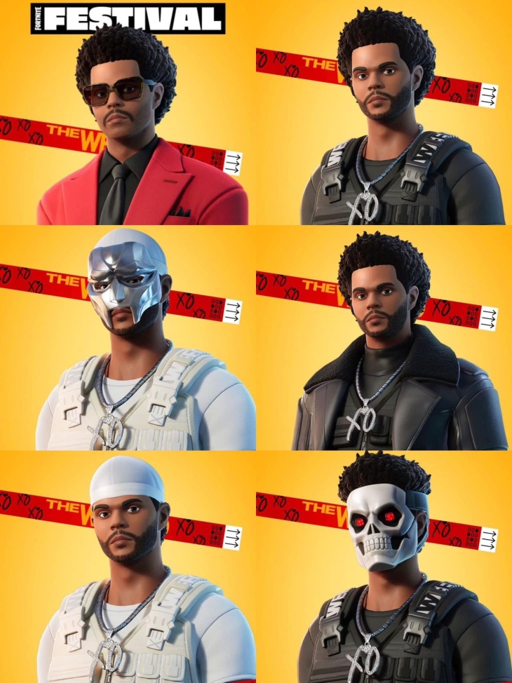 Por su parte, se filtraron los variados seis skins que se podrán elegir al momento de seleccionar a Tesfaye. Entre ellos, el primer atuendo podría ser el más característico del músico, donde se lo puede ver con un saco rojo y lentes negros; mientras que a partir del segundo se permite jugar más con los vestuarios, aunque mantiene la estética y estilo de The Weeknd.