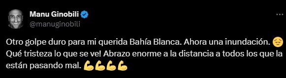 El sábado, Ginóbili había publicado un mensaje en sus redes sociales: “Otro golpe duro para mi querida Bahía Blanca. Ahora una inundación. ¡Qué tristeza lo que se ve! Abrazo enorme a la distancia a todos los que la están pasando mal“.