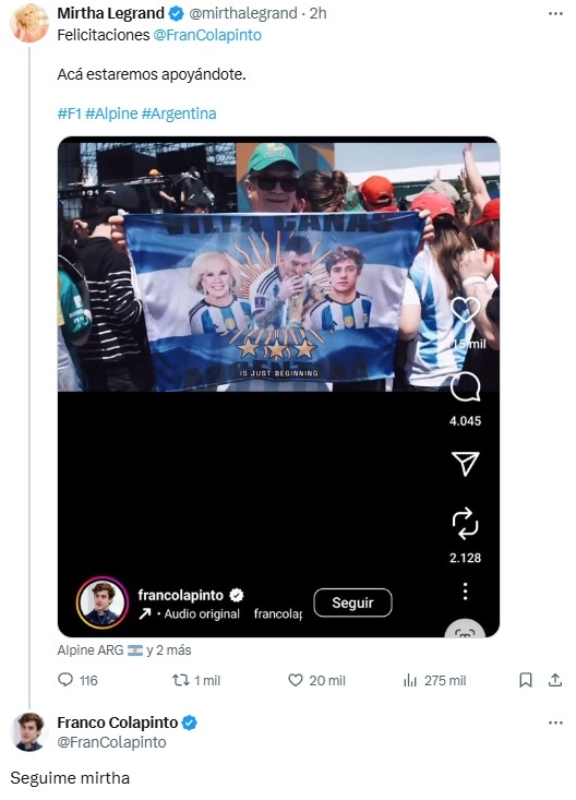 El piloto, fiel a su estilo, le respondió a la también actriz en la misma red social con un "Seguime Mirtha".