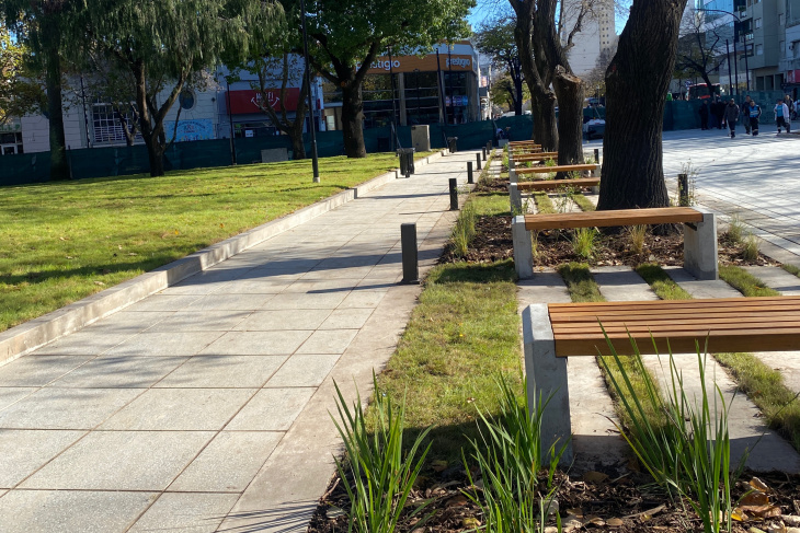 Uno de los aspectos centrales de la obra fue la renovación total de los solados, incorporando nuevas baldosas graníticas de 60 x 60 cm que jerarquizan los senderos peatonales y mejoran la accesibilidad. Además, se retiró el adoquinado que formaba parte de la antigua traza de avenida 7, lo que permitió crear un nuevo espacio peatonal que da mayor fluidez y amplitud al uso cotidiano de la plaza.