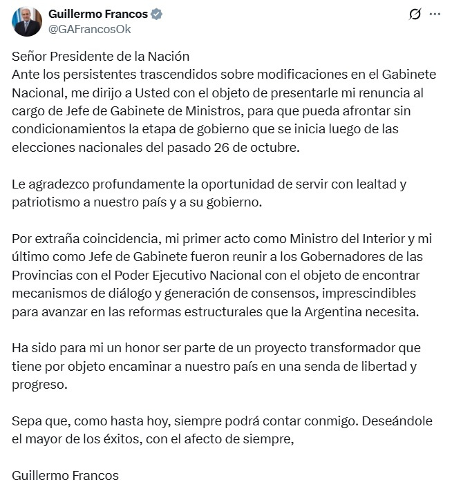 El texto, que fue difundido también en la cuenta oficial del exfuncionario, contiene tres mensajes claros. El primero, una alusión directa a los rumores sobre cambios en el gabinete, que precipitaron su salida. Apenas cuatro días antes, el propio Francos había asegurado en radio Mitre: “No hay ningún motivo particular para que deje el cargo. Me voy a quedar. Estoy trabajando sin ningún problema”.