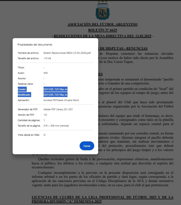 La imagen que confirma que el documento fue creado y modificado el día posterior a haberse disputado el partido entre Estudiantes y Rosario Central.