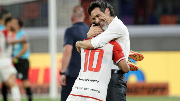 Domínguez abrazado a Tiago Palacios en la victoria de Estudiantes sobre Central Córdoba.