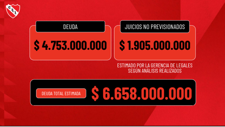 El nuevo presidente hizo públicas las cifras de Independiente: el pasivo ronda los 7 mil millones de pesos y el club pierde 100 millones de pesos por mes. Además tiene una deuda de $15 millones de pesos con un supermercado chino y $1 millón a una sandwichería.