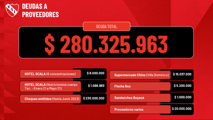 El vicepresidente de la institución, Néstor Grindetti contó algunas cifras en detalle: "En jugadores hay deudas por 11 millones de dólares y 800 mil euros. También, hay 69 millones de pesos por premios individuales a los jugadores y 230 millones de pesos otorgados en cheques. Por otra parte, hay deudas con 3 directores técnicos, Miguel Ángel Brindisi, Julio César Falcioni y Eduardo Domínguez”