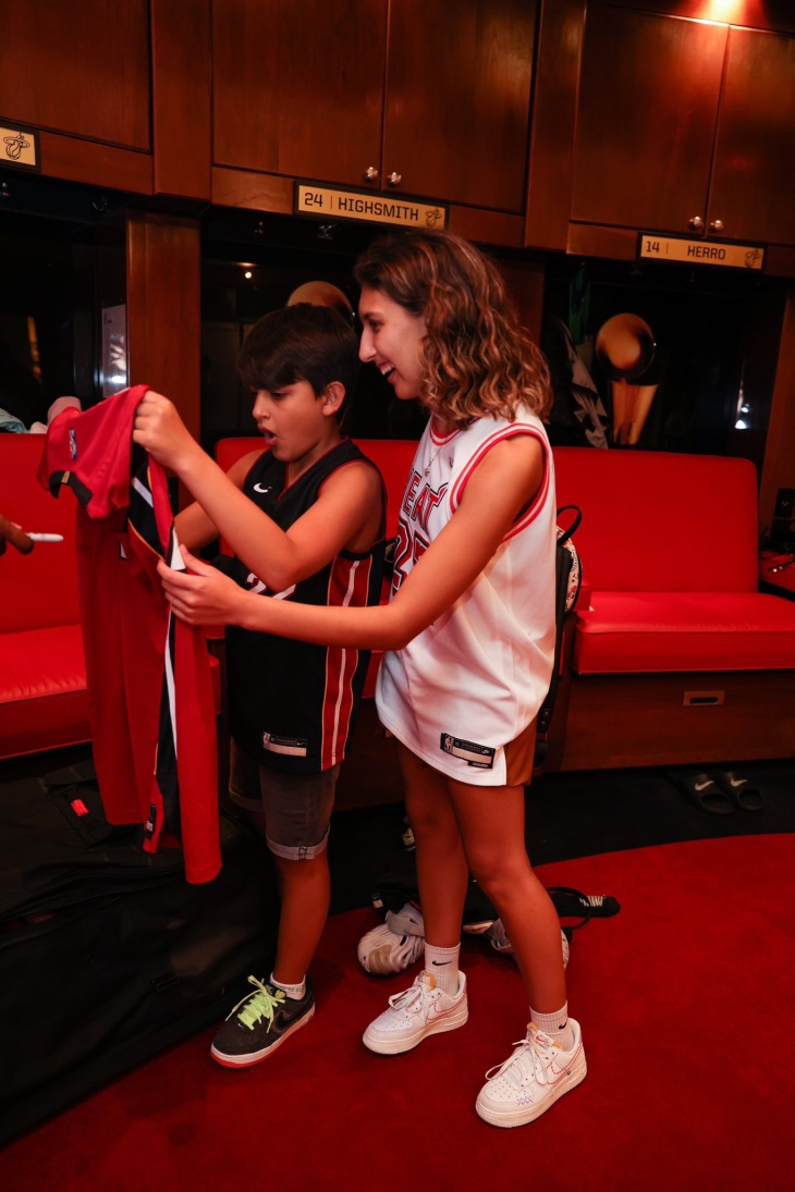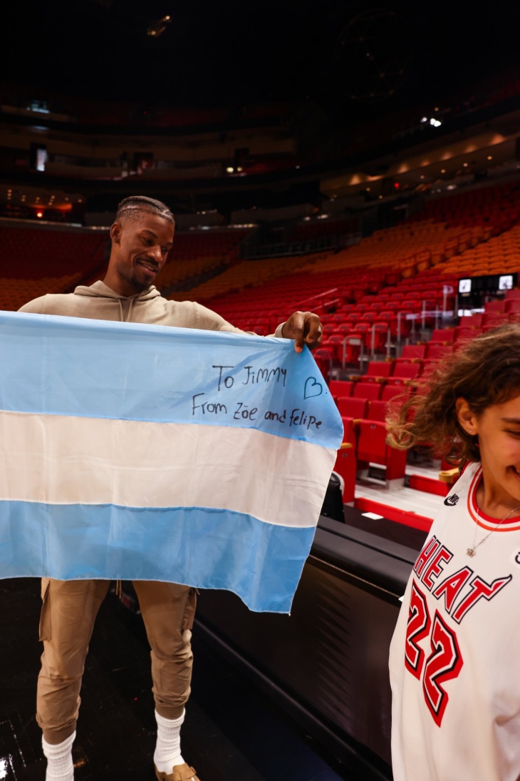 Por suerte para Felipe y Zoe, no todo fueron malas noticias. En el entretiempo los hicieron bajar a la cancha para obsequiarles la camiseta de Butler y una pelota. Pero hubo más: El propio jugador, que no estuvo ni en el banco de suplentes, los invitó al final del juego a recorrer el estadio y los vestuarios junto a él. Los niños por su parte, le regalaron una bandera argentina que decía "Para Jimmy, de Zoe y Felipe".