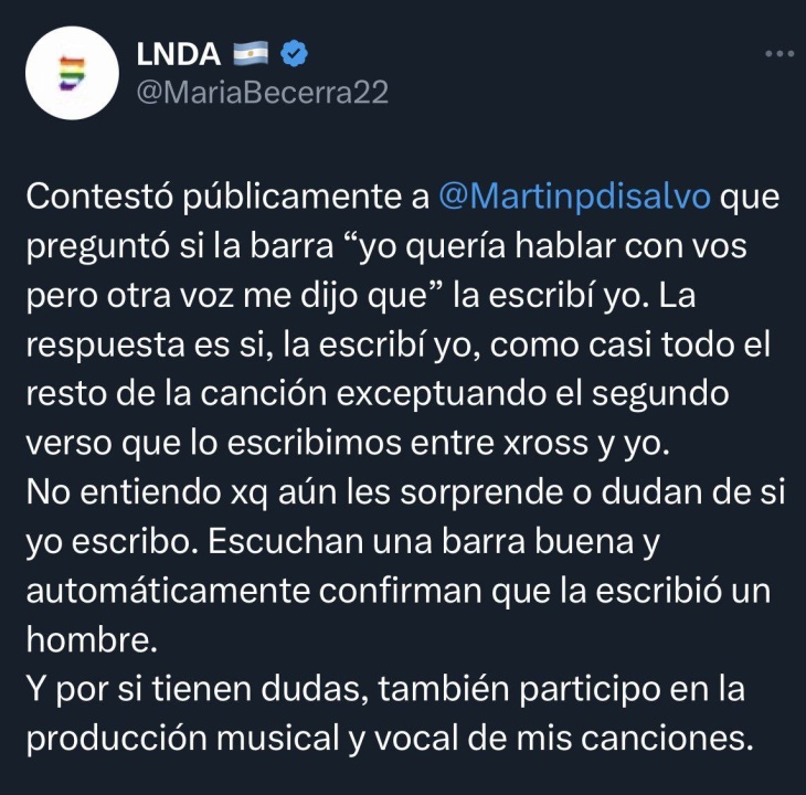 Sin embargo se viralizó un clip donde se muestra la parte donde el streamer pone en duda de quién escribió esa frase. Automáticamente el fandom de la cantante salió al cruce, y la misma María salió respondió enojada: "No entiendo xq aún les sorprende o dudan si yo escribo. Escuchan una barra buena y automáticamente confirman que la escribió un hombre"