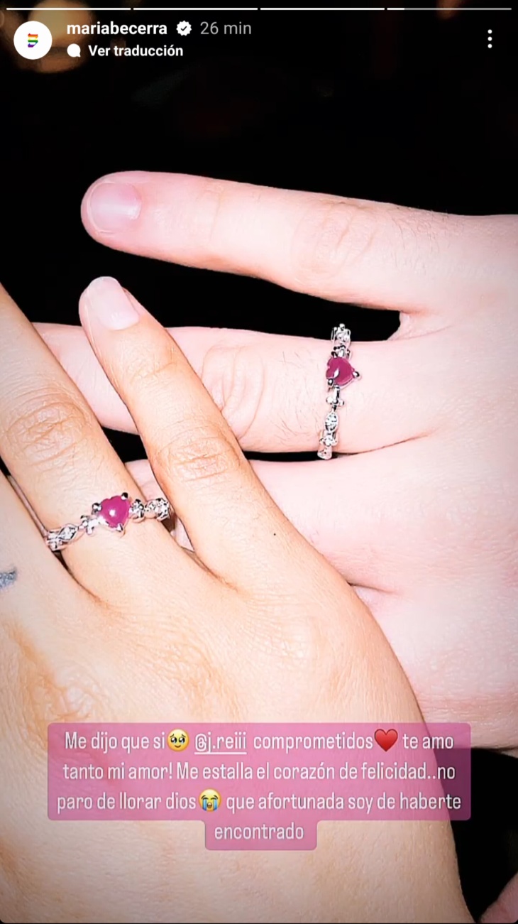 "Me dijo que si! @jreii comprometidos. Te amo tanto mi amor! Me estalla el corazón de felicidad... no paro de llorar dios, que afortunada soy de haberte encontrado" publicó María una historia de Instagram junto a la foto de los anillos.