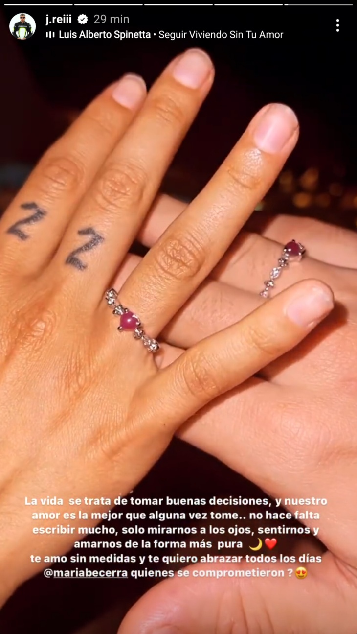 "La vida se trata de tomar buenas decisiones, y nuestro amor es la mejor que alguna vez tome... no hace falta escribir mucho, solo mirarnos a los ojos, sentirnos y amarnos de la forma más pura. Te amo sin medidas y te quiero abrazar todos los días @mariabecerra quienes se comprometieron'" publicó J Rei con un video de sus manos con los anillos, y musicalizada por "Seguir viviedno sin tu amor" de Luis Alberto Spinetta.