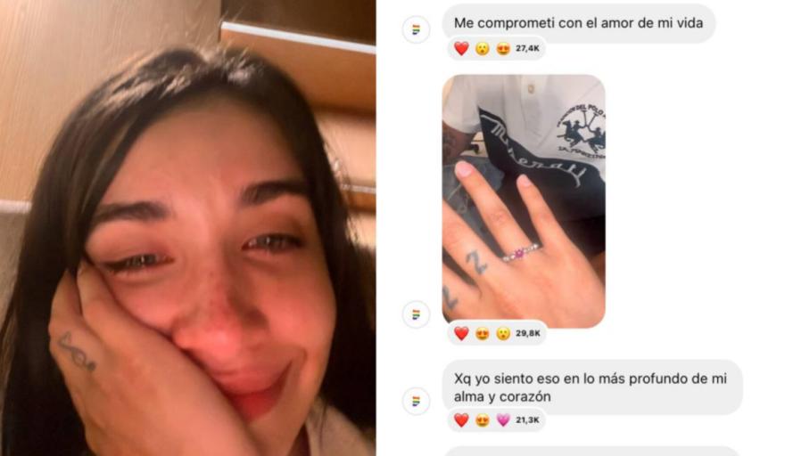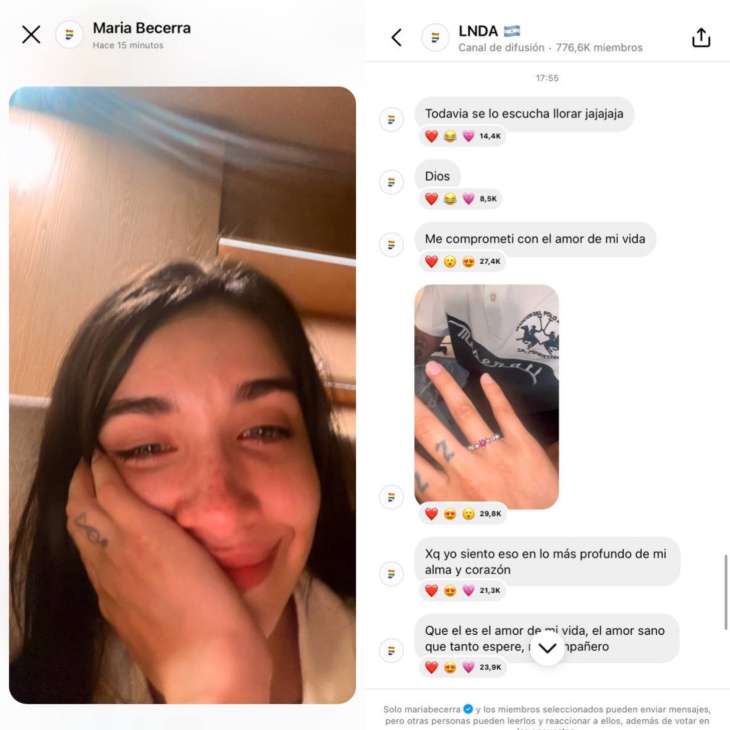 A su vez, María publicó en su canal de difusión de Instagram una foto de ella llorando, contando que se comprometió y explicando "es el amor de mi vida, el amor sano que tanto esperé, mi compañero"