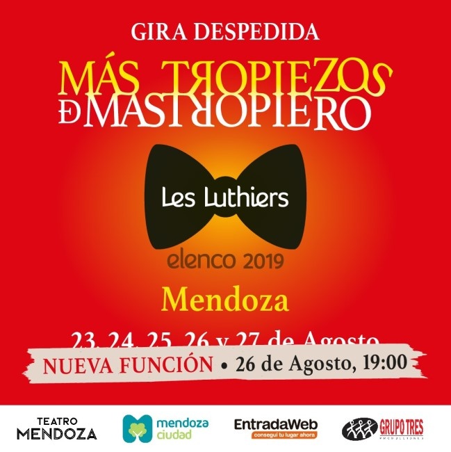 El grupo argentino humorístico-musical con 55 años de trayectoria, Les Luthiers, llevarán a cabo su ciclo de despedida con el espectáculo "Más tropiezos de Mastropiero" en el Teatro Mendoza de la Ciudad. Las funciones se podrán ver desde el miércoles 23 de agosto hasta el domingo 27.