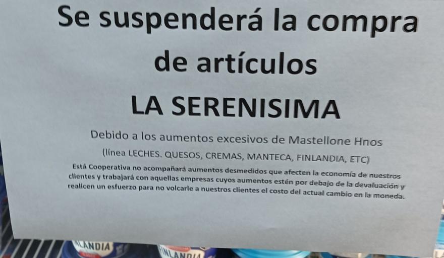 "Suspendida la venta de productos La Serenísima. No acompañamos los aumentos desmedidos que afecten la economía de nuestros clientes y trabajamos solo con marcas que sus aumentos están por debajo de la devaluación y realicen un esfuerzo en sus precios finales"