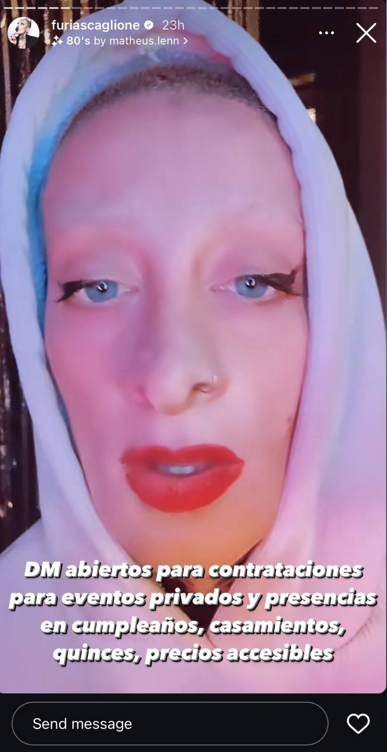 Todo comenzó en las últimas horas, cuando Furia apareció en su cuenta de Instagram, en la que la siguen más de 800 mil personas, y ofreció servicios de presencia en eventos privados, incluyendo cumpleaños y casamientos. En su publicación, invitó a sus seguidores a contactarla por mensaje directo (DM), asegurando tener “precios accesibles” para este tipo de celebraciones.