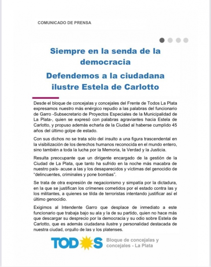 "Exigimos al Intendente Garro que desplace de inmediato a este funcionario que trabaja bajo su ala y la de su partido, quien no hace más que descargar su desprecio por la democracia y su odio sobre Estela de Carlotto, que es además ciudadana ilustre y personalidad destacada de nuestra ciudad, orgullo de las y los platenses", puntualiza el comunicado.