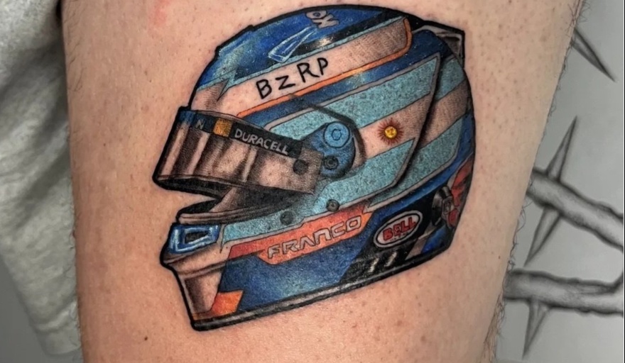 Este fanatismo ya empezó a inmortalizarse en la piel. Como es el caso de Diego Joao, de Isidro Casanova, quien decidió tatuarse el casco que utiliza Colapinto, con la bandera Argentina y el sello del dj y productor Bizarrap.
