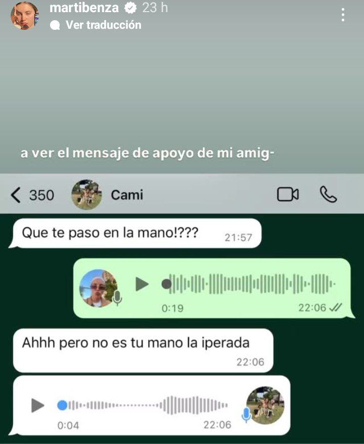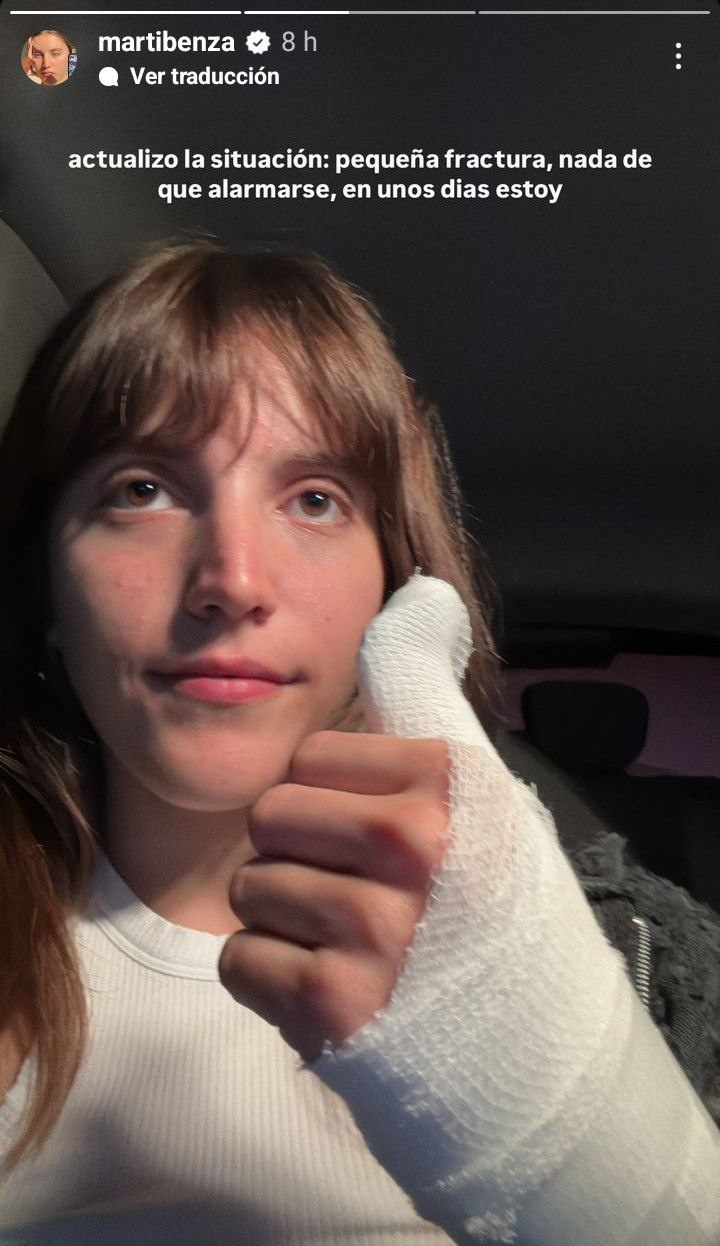 Sin embargo, horas más tarde la youtuber reapareció en sus redes para transmitir tranquilidad. “Actualizo situación”, escribió nuevamente mediante una historia de Instagram en la que se la puede ver a ella con el dedo pulgar de su mano enyesado. “pequeña fractura, nada de qué alarmarse, en unos días estoy”, concluyó.