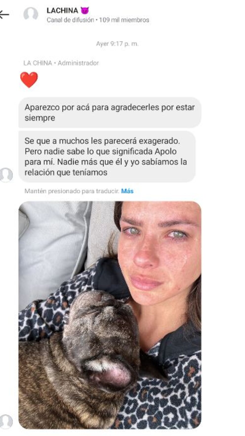 Previo a la drástica decisión, la actriz envió un mensaje a sus fanáticos por medio de su canal de difusión: “Aparezco por acá para agradecerles por estar siempre. Sé que a muchos les parecerá exagerado pero nadie sabe lo que significaba Apolo para mí”, comenzó diciendo la actriz, y sumó: “Nadie más que él y yo sabíamos la relación que teníamos”, escribió Suárez .