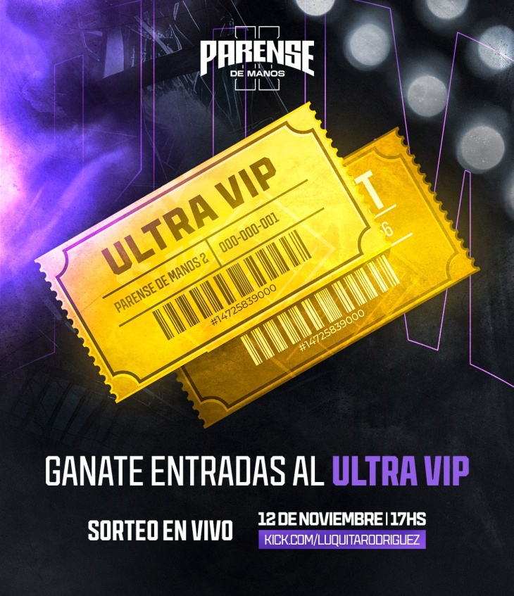 Según la información oficial, las entradas que se sortearán son únicas ya que no están a la venta y son denominadas ULTRA VIP NORTE donde seguramente tendrá acceso exclusivo a los peleadores e invitados de lujo que tendrá Párense de Manos. Para participar hay que presenciar el stream desde el canal de Kick de Luquitas Rodríguez.