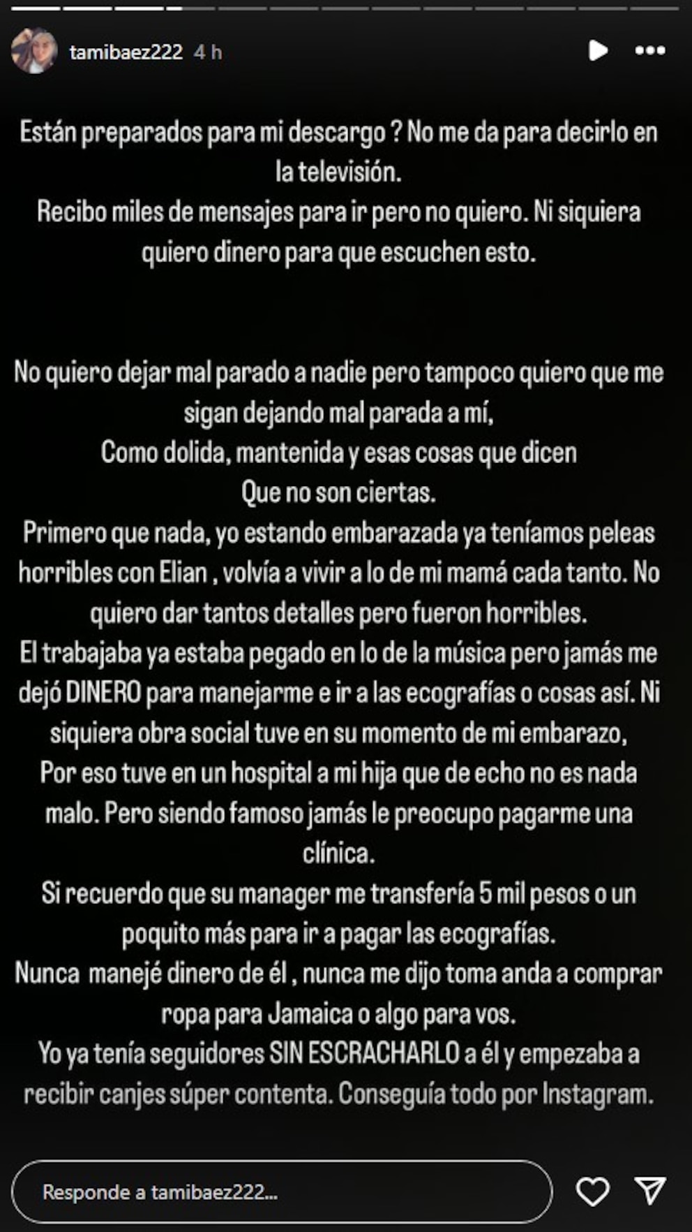 "Primero que nada yo estando embarazada ya teníamos peleas horribles con Elián, yo volvía a vivir a lo de mi mamá cada tanto”, aseguró. Más adelante, se explayó: “Él trabajaba, ya estaba pegado en lo de la música, pero jamás me dejó dinero para manejarme, ni para las ecografías. Ni siquiera obra social tuve en su momento en mi embarazo. Por eso tuve a mi hija en un hospital, que de hecho no es nada malo pero siendo famoso jamás le preocupó pagarme una clínica. Sí recuerdo que su manager me transfería 5 mil pesos o un poquito más para pagarme las ecografías. Nunca manejé dinero de él, nunca me dijo ‘tomá anda a comprar ropa para Jamaica o para vos’. Yo ya tenía seguidores y ya empezaba a tener canjes súper contenta. Conseguía todo por Instagram”, explicó a través de Instagram.