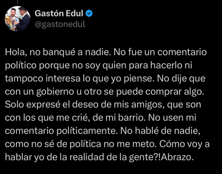 “Hola, no banqué a nadie. No fue un comentario político porque no soy quien para hacerlo ni tampoco interesa lo que yo piense. No dije que con un gobierno u otro se puede comprar algo. Solo expresé el deseo de mis amigos, que son con los que me crié, de mi barrio. No usen mi comentario políticamente. No hablé de nadie, como no sé de política no me meto. ¿Cómo voy a hablar yo de la realidad de la gente? ¡Abrazo!”, escribió.