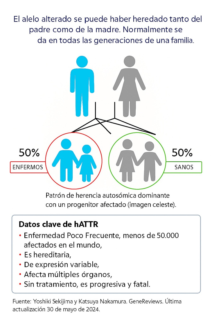 La hATTR se transmite de generación en generación con un 50% de probabilidad de herencia. Puede manifestarse de forma temprana, alrededor de los 30 años, o tardía, después de los 60, dependiendo de la mutación genética. En Argentina, la variante más frecuente es la Val50Met, seguida por la Val142Ile.
