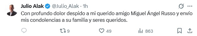 “Con profundo dolor despido a mi querido amigo Miguel Russo y envío mis condolencias a su familia y seres queridos”, escribió el jefe comunal en su cuenta de X