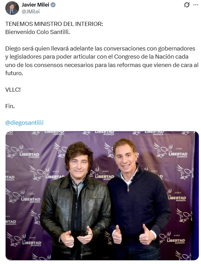 La confirmación se produjo horas después de una reunión en la Quinta de Olivos entre Milei y su asesor Santiago Caputo, en la que se definió el nombre de Santilli, quien viene de competir en la provincia de Buenos Aires bajo la lista de La Libertad Avanza. “Tenemos nuevo ministro. Bienvenido Colo”, escribió el Presidente en un mensaje que cerró con su habitual “¡Viva la libertad, carajo!”.