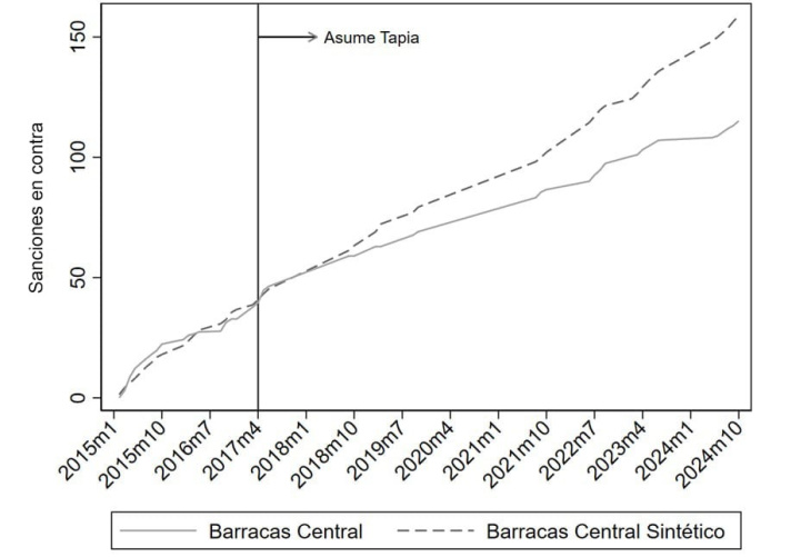 De esta manera se formó un “Barracas Central sintético”, equivalente estadístico frente al cual comparar al equipo real. Los resultados muestran que hasta abril de 2017 ambas curvas de desempeño evolucionaban en paralelo, pero tras la llegada de Tapia a la AFA la brecha se amplió sostenidamente a favor del Guapo.