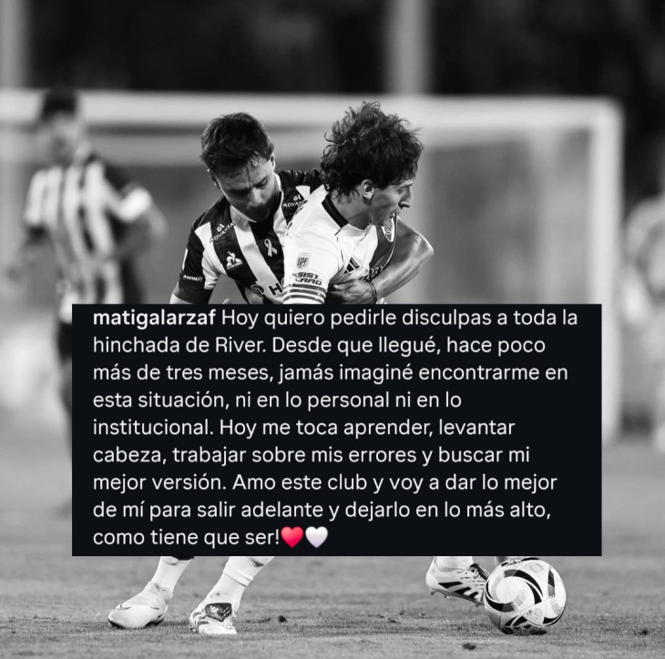 La derrota golpeó fuerte en Núñez y el futbolista decidió hablar apenas un día después. A través de sus redes sociales, Galarza publicó un mensaje dirigido a los hinchas y al plantel, donde asumió su responsabilidad y manifestó su intención de revertir la situación: “Hoy quiero pedirle disculpas a toda la hinchada de River… Hoy me toca aprender, levantar cabeza, trabajar sobre mis errores y buscar mi mejor versión”, escribió.