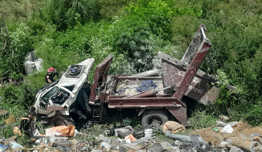 Un camión de la empresa de Lamterna - Servicios de Volquetes, cayó varios metros al vacío mientras se encontraba descargando desperdicios en una cantera de Melchor Romero ubicada en 176 bis y 529.