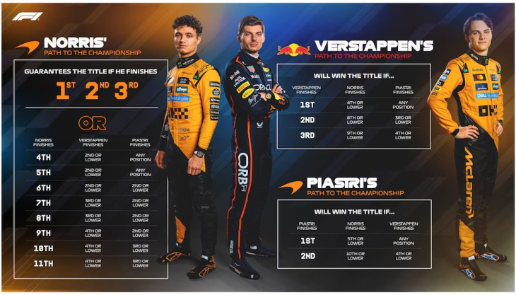 Actualmente, los tres candidatos suman siete triunfos. Pero Norris tiene ventaja: acumula ocho podios como segundo, contra cinco de Verstappen y cuatro de Piastri.
