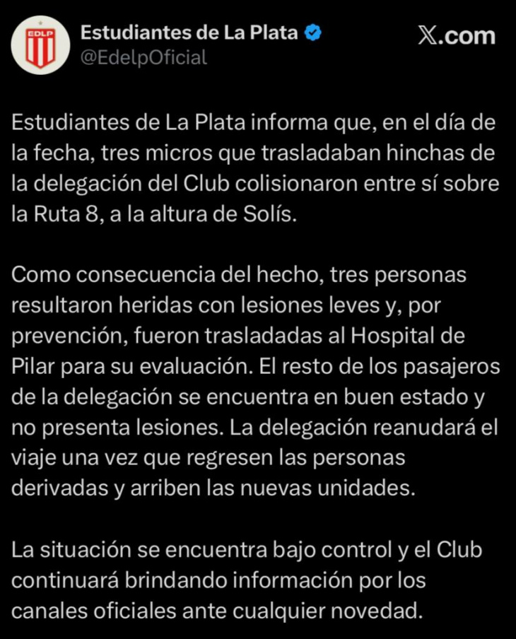 Asimismo, remarcaron que la situación está bajo control y que Estudiantes de La Plata continuará informando cualquier novedad a través de sus canales oficiales.