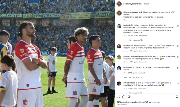 En las últimas horas una página de Rosario Central en Instagram (derosarioydecentralok) le dedicó un posteo a Estudiantes de una foto de, en este caso, Leandro González Pirez dandole la mano a Claudio Tapia con una sonrisa en la premiación de la final del Clausura y haciendo alusión al pasillo de espaldas. El pie de foto dice: "Verón, ex jugador, de familia de futbolistas, dio la orden para que sus futbolistas les den la espalda a sus colegas, cuando el problema era con la AFA, cuando tuvieron a la AFA a metros, le dieron la mano de frente, es por eso que son ingleses, caretas y vendidos".
