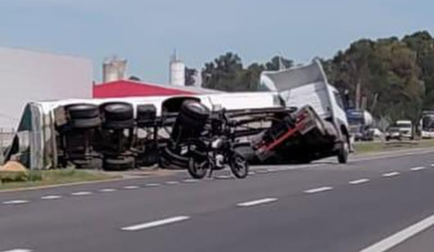 El siniestro vial ocurrió en la autovía a la altura del kilómetro 57,5, cuando el conductor del camión Mercedes Benz perdió el control intentando retomar la bajada al pasarse del cruce de Etcheverry y terminó volcado sobre la calzada tapando el sector de acceso.