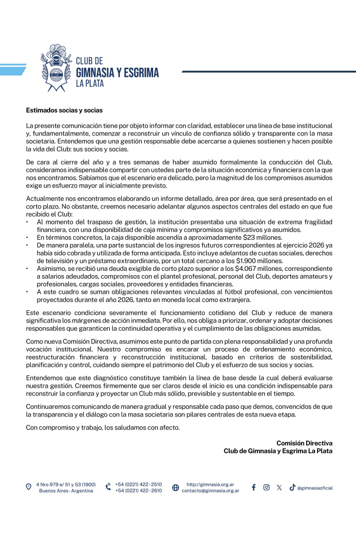 Antes del desgloce de la situación económica y financiera de Gimnasia, la nueva CD del club deja en claro que sabian "que el escenario era delicado", pero que "la magnitud de los compromisos asumidos exige un esfuerzo mayor al inicialmente previsto".