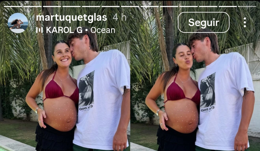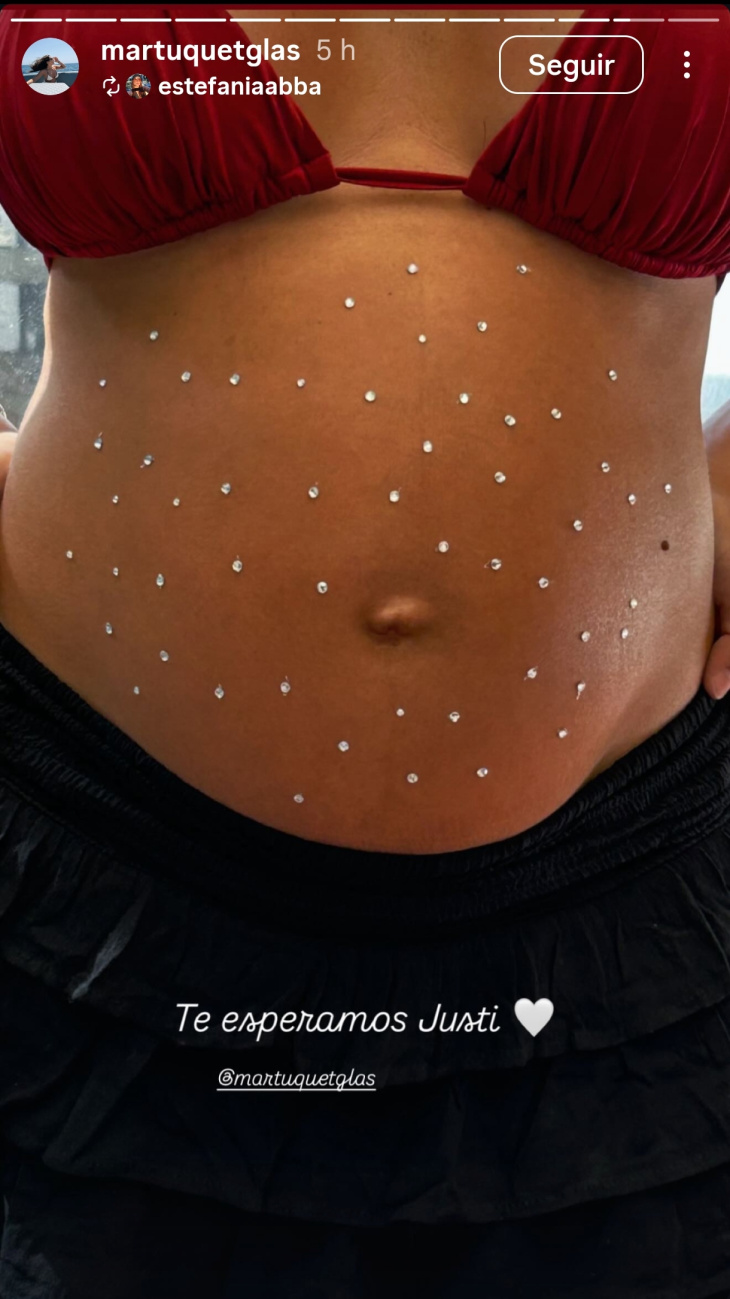 Las imágenes, publicadas principalmente en las historias de Instagram del artista y su pareja, reflejan una ambientación cálida y delicada, pensada para acompañar este momento tan especial. Martina fue la gran protagonista de la jornada: lució su embarazo con orgullo y mostró su pancita decorada con pequeños destellos plateados, en un diseño sutil que combinó arte y emoción. Vestida con una bikini bordó y una falda negra, acompañó una de las postales con un mensaje breve pero cargado de sentimiento: “Te esperamos, Justi”, junto a un corazón blanco.