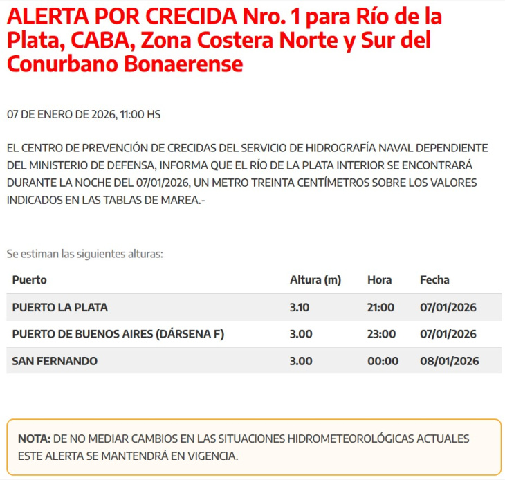 El Centro de Prevención de Crecidas del Servicio de Hidrografía Naval que depende del Ministerio de Defensa, informó y emitió un alerta sobre la crecida del Río de La Plata, el cual se encontrará tres metros por encima sobre los valores que indican las tablas de mareas.