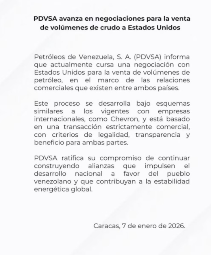 El anuncio se conoció luego de que Petróleos de Venezuela S.A. (PDVSA) confirmara que mantiene negociaciones con Washington para la venta de “volúmenes de petróleo”. En un comunicado oficial, la empresa estatal explicó que el proceso se desarrolla bajo esquemas similares a los vigentes con compañías internacionales como Chevron, con criterios de legalidad, transparencia y beneficio mutuo.