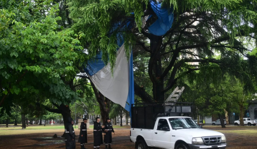 En Plaza Moreno, la bandera argentina izada en la esquina de 14 y 53 se rompió como consecuencia de las intensas ráfagas de viento y terminó colgada en un árbol, generando sorpresa entre los vecinos y transeúntes.