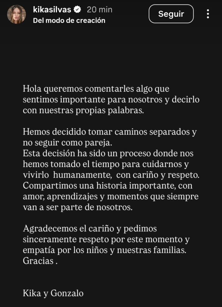 Valenzuela y Silva compartieron un comunicado conjunto en Instagram en el que explicaron que “hemos decidido tomar caminos separados y no seguir como pareja”. Señalaron que la decisión fue parte de un proceso en el que se cuidaron mutuamente y que buscan transitar este momento con serenidad. Además, destacaron que comparten una historia importante, con amor y aprendizajes, y agradecieron el cariño de sus seguidores. También solicitaron respeto y empatía por sus familias en este momento delicado.
