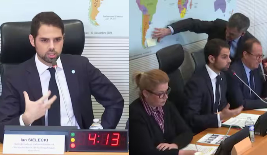 Al notar la irregularidad cartográfica, Sielecki interrumpió la presentación de Bruno Fuchs, presidente de la comisión. "Lamentablemente debo señalar que existe un pequeño problema que, en realidad, es un gran problema para mi país", sentenció el diplomático de 36 años. A pesar de que Fuchs intentó minimizar el hecho argumentando que se trataba de un "territorio en disputa", el embajador mantuvo su postura: "Está señalado como Reino Unido. Ese es el punto".