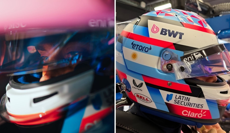 Estética: Se mantiene la bandera argentina flanqueando el visor, aunque con una tonalidad de azul ligeramente más integrada al "azul Alpine" del monoplaza.