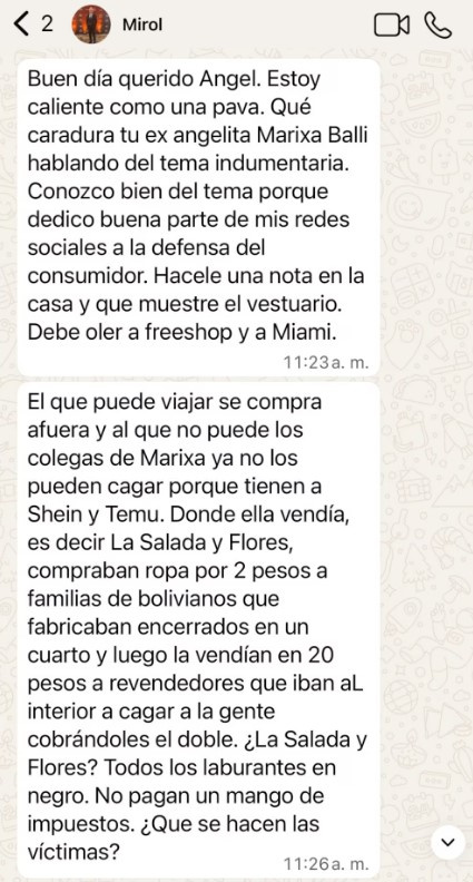 “Buen día querido Ángel. Estoy caliente como una pava. Qué caradura tu exangelita Marixa Balli hablando del tema indumentaria. Conozco bien del tema porque dedico buena parte de mis redes sociales a la defensa del consumidor. Hacela una nota en la casa y que muestre el vestuario. Debe oler a free shop y a Miami”, escribió el periodista, marcando el tono de su descargo.