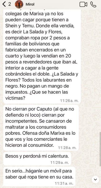El periodista también cargó contra el funcionamiento del sector textil y comercial: “El que puede viajar se compra afuera y al que no puede, los colegas de Marixa ya no los pueden cagar porque tienen otras marcas. Donde ella vendía, es decir La Salada y Flores, compraban ropa por dos pesos a familias de bolivianos que fabricaban encerrados en un cuarto y después la vendían a precios altísimos. Todos laburantes en negro, sin pagar impuestos. ¿De qué se hacen las víctimas?”.