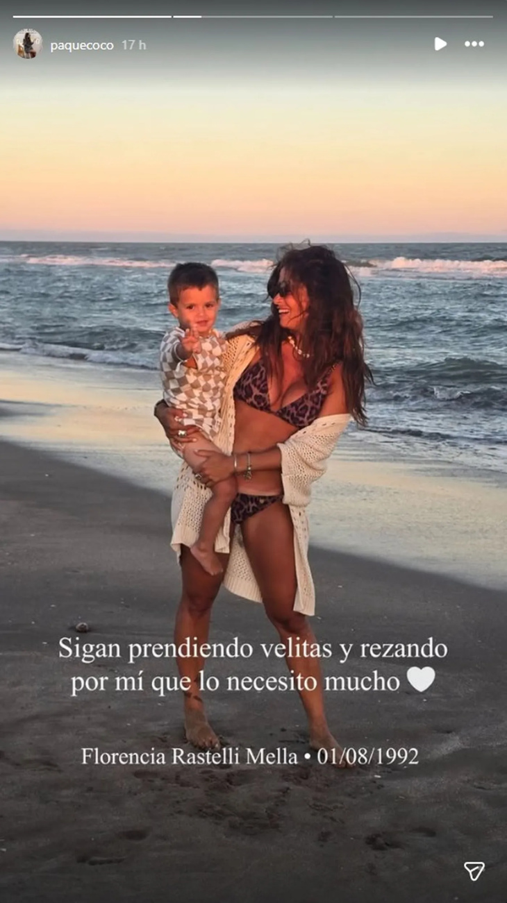 La historia publicada muestra una imagen de Florencia en la playa junto a su hijo, en un momento familiar. Sobre la foto se lee: “Sigan prendiendo velitas y rezando por mí que lo necesito mucho”.