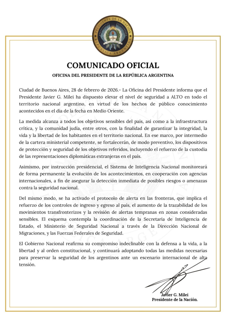 “El Presidente Javier G. Milei ha dispuesto elevar el nivel de seguridad a ALTO en todo el territorio nacional argentino, en virtud de los hechos de público conocimiento acontecidos en el día de la fecha en Medio Oriente”, señala el texto difundido por el Ejecutivo.